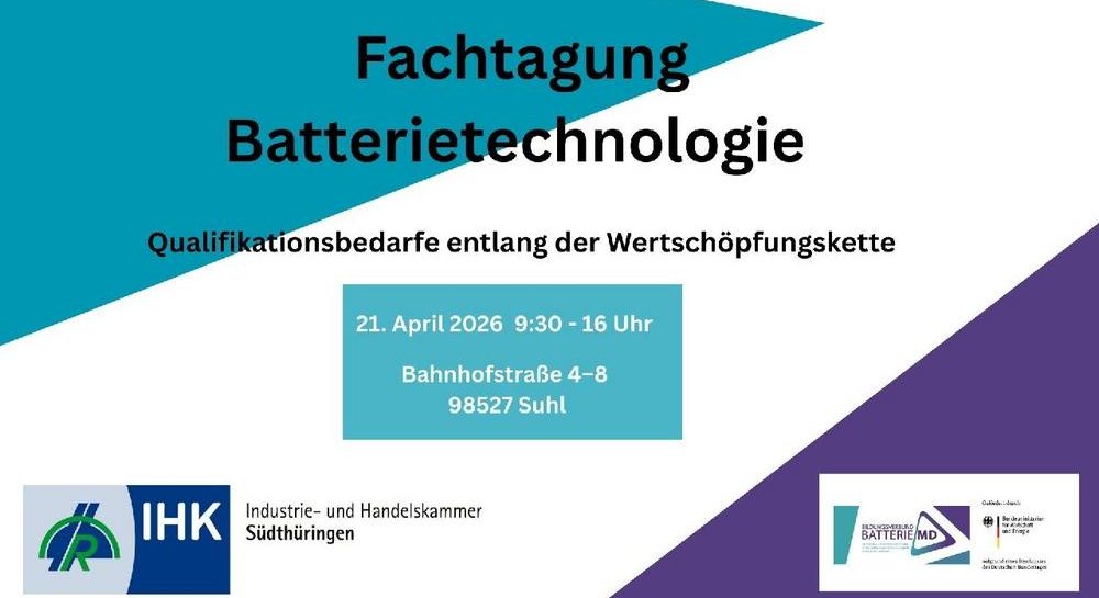 Die Batteriebranche wächst in rasantem Tempo – von der Zellfertigung über die Montage bis hin zum Recycling. Damit entsteht ein dynamischer Markt mit enormem Fachkräftebedarf. Doch wie begegnen wir dieser Entwicklung: mit einem völlig neuen Berufsbild wie dem „Batterietechnologen“ oder durch gezielte Qualifizierungen innerhalb bestehender Strukturen? Gemeinsam mit dem Bildungsverbund Batterie MD lädt die IHK…„Batterietechnologie im Aufwind – jetzt das Berufsbild von morgen mitgestalten! (Konferenz | Suhl)“ weiterlesen