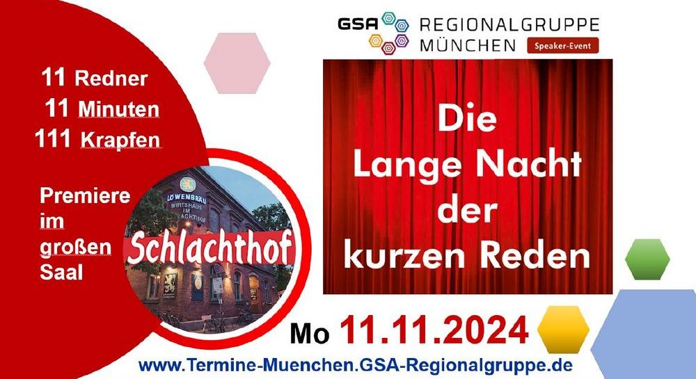 Nach den gelungenen Speaker-Events in den Jahren 2016, 2017, 2018 , 2019, 2021, 2022 und 2023 lädt die GSA-Regionalgruppe München am 11. November 2024 wieder zur „Langen Nacht der kurzen Reden“. 11 Speaker werden jeweils in 11 Minuten höchst unterschiedliche Themen vortragen. Auch in 2024 wird „Die Lange Nacht der kurzen Reden“ wieder im urig…„Die Lange Nacht der kurzen Reden – 11 Redner je 11 Minuten und 111 Krapfen (Workshop | München)“ weiterlesen