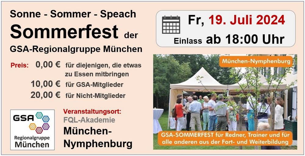 Das Sommerfest findet in einem Garten in München (Nymphenburg/Gern) statt. Es werden sowohl Stehtische als auch Bierbänke/Tische zur Verfügung stehen. Im Vordergrund des Sommerfest steht der ungezwungene Austausch untereinander. Jeder Gast kann/darf nicht nur seine/n Partner/in sondern auch etwas zu essen mitbringen (Salat, Salziges oder Süßes) … und kann dann kostenfrei beim Sommerfest dabei sein. Wer nichts mitbringt, zahlt…„Sonne – Sommer – Speach: Das Sommerfest der GSA-Regionalgruppe München (Workshop | München)“ weiterlesen