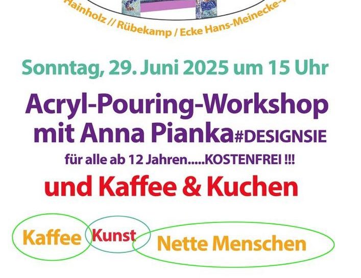 Am Sonntag, den 29. Juni 2025, lädt der MSV Hannover e.V. zum Event “Kaffee & Kunst im Teegarten” zu einem besonderen Acryl-Pouring-Workshop ein. Die Veranstaltung findet in der Rübekamp / Ecke Hans-Meineke Weg statt. Interessierte ab 12 Jahren sind herzlich willkommen, ab 15:00 Uhr gemeinsam mit der Künstlerin Anna Pianka die Technik des Acryl-Pouring kennenzulernen…„Kaffee & Kunst im Teegarten: Acryl-Pouring-Workshop mit Designsie in Hannover am 29.06.2025 (Unterhaltung / Freizeit | Hannover)“ weiterlesen