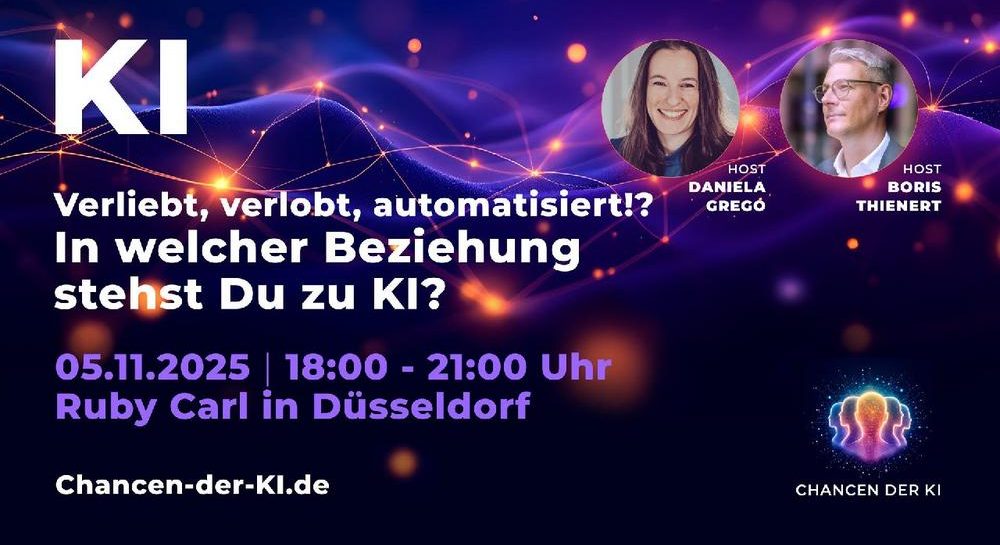 „Verliebt, verlobt, automatisiert!?“ – KI-Community feiert 5-jähriges Bestehen mit Event für KMU´s Düsseldorf, 05. November 2025 – Die CHANCEN DER KI Community lädt zum Jubiläums-Event ins Ruby Carl Workspace Düsseldorf ein. Unter dem Motto „Verliebt, verlobt, automatisiert!? – In welcher Beziehung stehst Du zu KI?“ treffen sich KMU-Vertreter:innen zum Austausch über Künstliche Intelligenz im Unternehmensalltag….„Verliebt, verlobt, automatisiert!? – In welcher Beziehung stehst Du zu KI? (Networking | Düsseldorf)“ weiterlesen