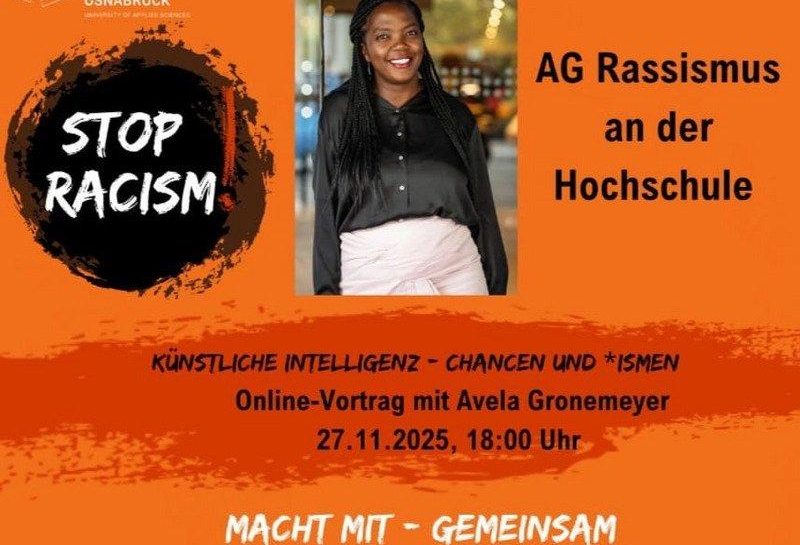 Am Donnerstag, 27. November, um 18 Uhr, lädt die AG Rassismus der Hochschule Osnabrück zum Online-Vortrag „Künstliche Intelligenz – Chancen und Ismen“ mit Avela Gronemeyer ein. Avela Gronemeyer (M.Sc. Wirtschaftsinformatik) ist Unternehmens- und Technologieberaterin sowie Solution Lead Smarter Greener Futures. Sie spricht über die Chancen und Herausforderungen künstlicher Intelligenz – von verantwortungsvoller Innovation über ethische…„Online-Vortrag „Künstliche Intelligenz – Chancen und Ismen“ (Vortrag | Online)“ weiterlesen