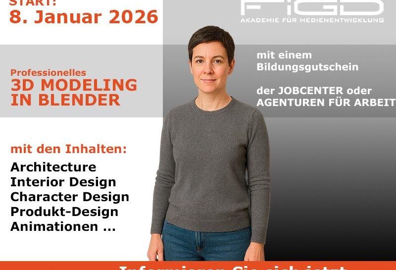 Wer schon immer davon geträumt hat, virtuelle Welten zu erschaffen und 3D-Objekte zum Leben zu erwecken, findet jetzt die passende Weiterbildung: Der Kurs „3D Modeling“ der FiGD Akademie in Berlin startet am 08.01.2026 und richtet sich an kreative Menschen mit technischem Gespür und ersten Softwarekenntnissen. Innerhalb von rund drei Monaten erwerben die Teilnehmerinnen und Teilnehmer…„Kreativität in 3D: Mit dieser Weiterbildung in die Medienwelt starten (Schulung | Online)“ weiterlesen