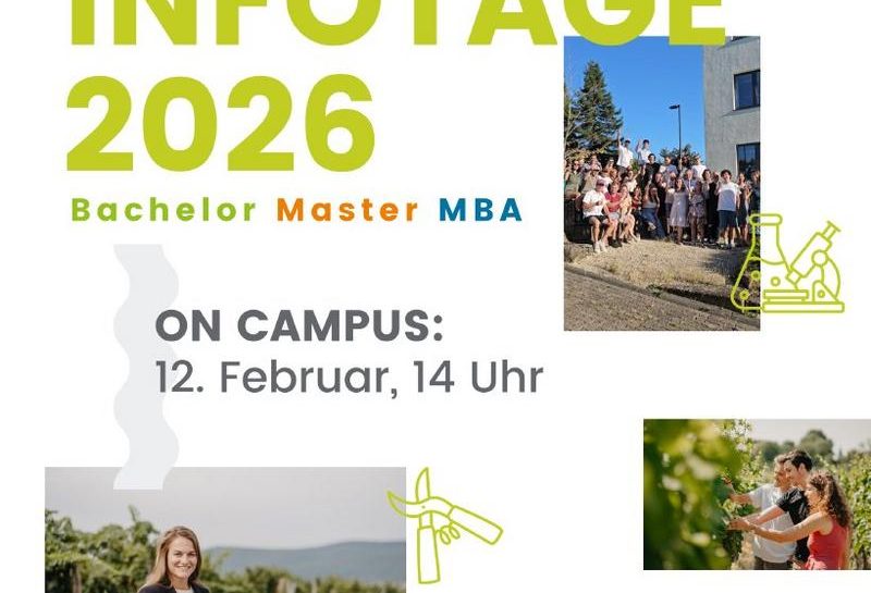Schnuppervorlesung – Campusführung – Erfahrungsberichte von Alumni – Aromaparcours – Informationsbörse – Individuelle Beratung Passt ein Studium am Weincampus zu mir und was erwartet mich?Diese Frage wird am Infotag durch ein vielfältiges Programm „zum Anfassen“ geklärt. Die Studieninteressierten, ihre Familien und Freunde erwartet eine Schnuppervorlesung von Prof. Dr. Ulrich Fischer, eine Informationsbörse sowie ein Rundgang…„Infotag für Studieninteressierte (Sonstiges | Neustadt an der Weinstraße)“ weiterlesen
