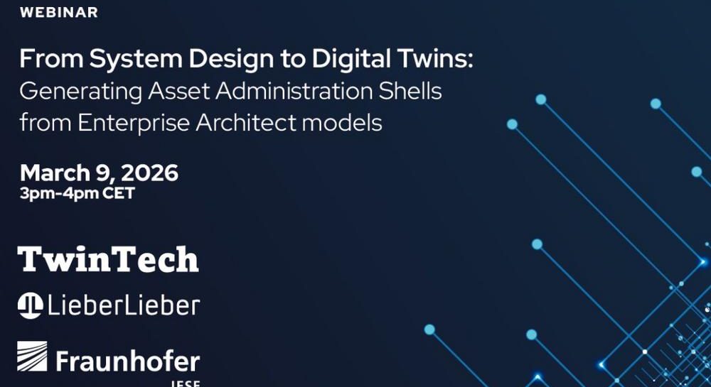 Gemeinsam mit unseren Partnern Twintech und Fraunhofer IESE laden wir Sie sehr herzlich zum Webinar „From System Design to Digital Twins: Generating Asset Administration Shells from Enterprise Architect models“ am Montag 9. März 2026 (15:00 – 16:00 Uhr) ein.