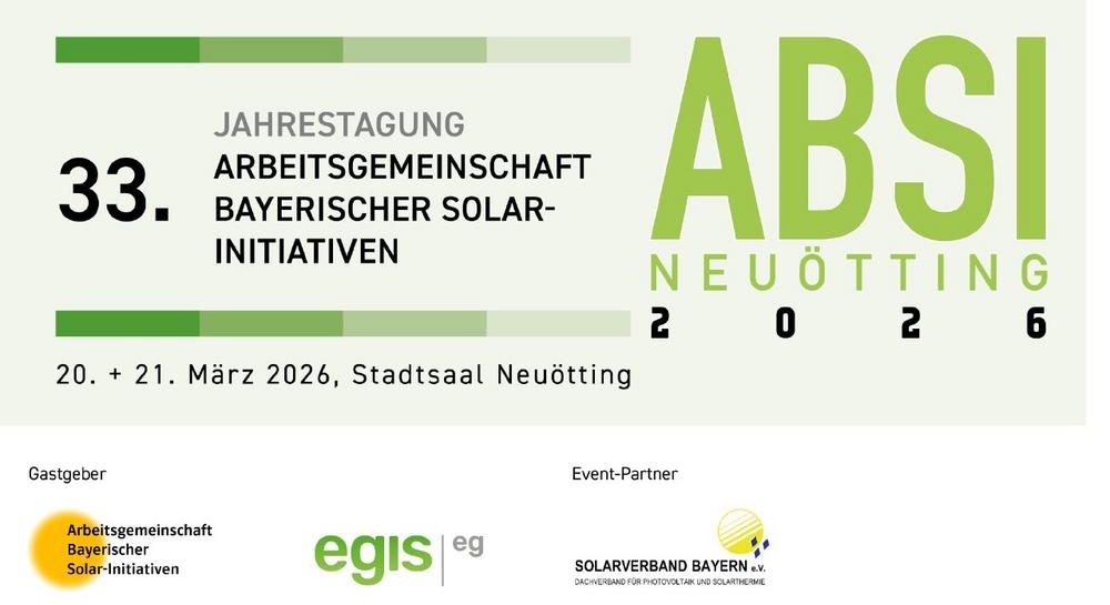 Die 33. ABSI-Jahrestagung findet am 20. und 21. März 2026 in Neuötting statt. Als Gastgeberin lädt die EGIS eG gemeinsam mit der Arbeitsgemeinschaft Bayerischer Solar-Initiativen zu zwei Tagen voller Fachvorträge, Panels und Austausch ein. Unter dem Leitmotiv „Erneuerbare – rund um die Uhr (nutzen)“ beleuchtet das Programm aktuelle Themen der Energiewende – von kommunalen Strategien über Großspeicher und Windenergie bis hin zu Innovationen und Bürgerenergie.