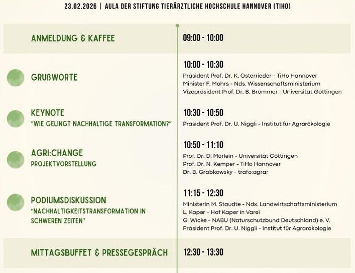 Die Auftaktveranstaltung ist eingebettet in die Tagung „Zukunft durch Wandel?! – Brauchen wir Nachhaltigkeitstransformation in schweren Zeiten?“ am 23. Februar 2026 an der Stiftung Tierärztliche Hochschule Hannover.