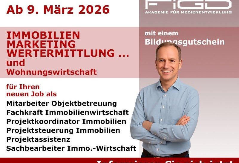 Ihre Zukunft in der Immobilienbranche beginnt hier Am 09. März 2026 startet die praxisorientierte Vollzeit-Weiterbildung im Bereich Immobilien, Marketing, Wertermittlung und Wohnungswirtschaft. Die Immobilienbranche bietet stabile Beschäftigungsperspektiven und vielfältige Tätigkeitsfelder – von der Objektbetreuung über Projektkoordination bis hin zur sachbearbeitenden Tätigkeit in der Immobilienentwicklung. Um in diesem anspruchsvollen Umfeld erfolgreich zu agieren, benötigen Sie fundierte…„Wertermittlung und Wohnungswirtschaft praxisnah erlernen (Schulung | Online)“ weiterlesen