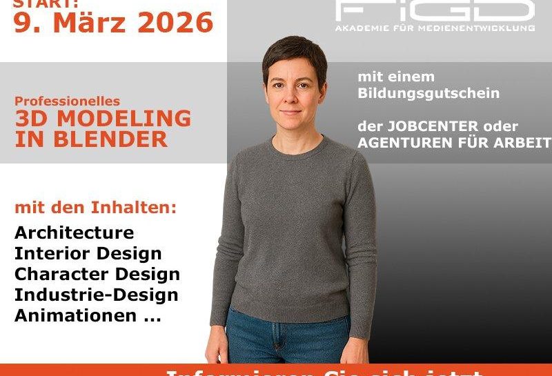 Ihre Karriere im 3D-Bereich beginnt hier Am 09. März 2026 startet die praxisorientierte Vollzeit-Weiterbildung „Professionelles 3D Modeling in Blender“. In einer zunehmend digitalisierten Medien- und Kreativwirtschaft sind hochwertige 3D-Visualisierungen, Animationen und interaktive Mediensysteme gefragter denn je. Ob in Architektur, Interior Design, Character Design, Industrie-Design oder im Bereich Games und Animation – fundierte 3D-Kompetenzen eröffnen Ihnen…„Von Architektur bis Character Design: 3D Modeling intensiv (Schulung | Berlin)“ weiterlesen