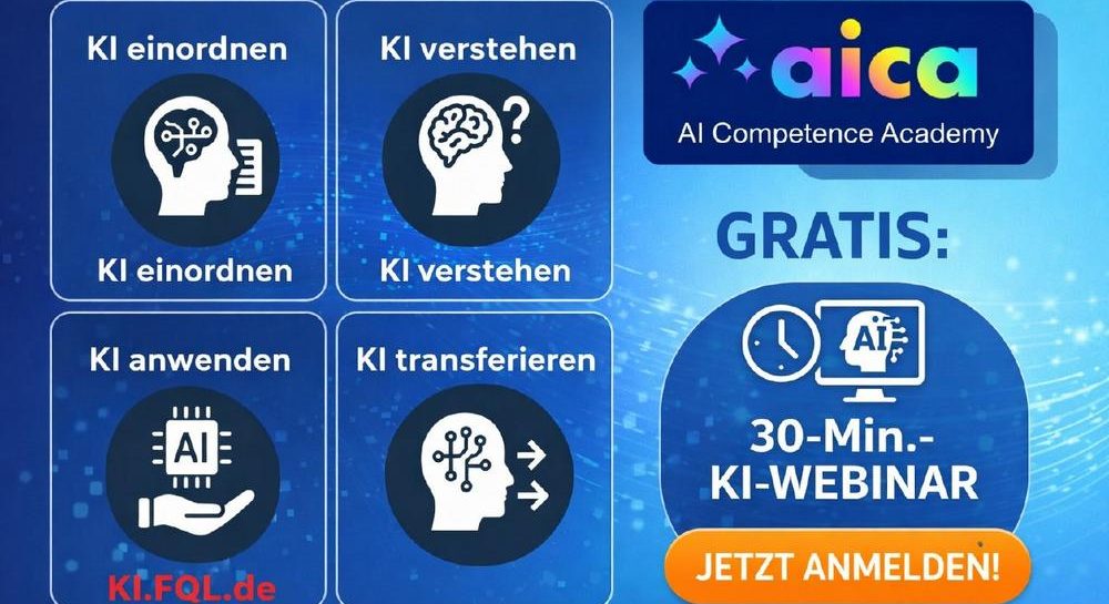 Künstliche Intelligenz verändert in rasantem Tempo, wie wir denken, arbeiten und entscheiden – in jedem Berufsfeld. Doch eines ist klar: Nur wer KI wirklich versteht, steuern und verantwortungsvoll einsetzen kann, bleibt auch in Zukunft handlungsfähig und wettbewerbsstark. Seit Oktober diesen Jahres bietet die AI Competence Academy Trainern, Beratern und Coaches, Unternehmern und Führungskräften sowie Office-Mitarbeitern eine KI-Online-Ausbildung, die…„GRATIS-Webinar für staatliches Zertifikats-KI-Online-Lernprogramm (Webinar | Online)“ weiterlesen