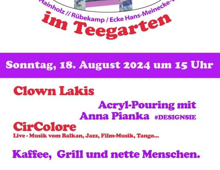 Der Verein Miteinander für ein schöneres Viertel – MSV e.V. richtet ein Sommerfest im Teegarten in Hannover Hainholz aus. Am Sonntag, dem 18.08.2024 um 15 Uhr startet das Sommerfest, bei welchem das vielfältige Sommer-Programm seinen Abschluss findet. Mit Kaffee und Kuchen, Live-Musik von CirColore, dem lustigen Clown Lakis, Grillspezialitäten, Spielen und einem Acrylpouring-Workshop mit Anna…„Sommerfest im Teegarten Hannover im Stadtteil Hainholz am 18.08.2024 mit Designsie Acrylic-Pouring (Unterhaltung / Freizeit | Hannover)“ weiterlesen
