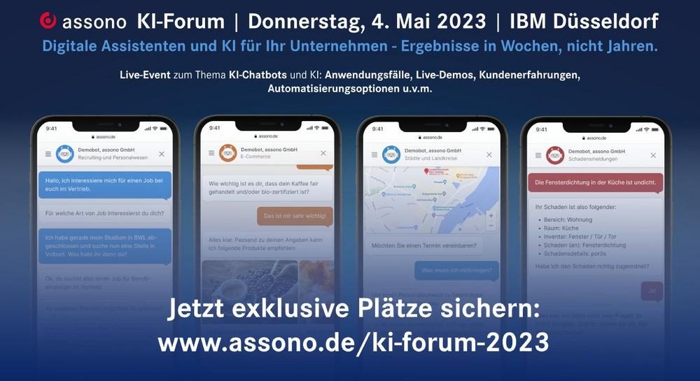 Digitale Assistenten und KI für Ihr Unternehmen – Ergebnisse in Wochen, nicht Jahren. Das assono KI-Forum ist ein exklusives Event für Entscheider und Projektverantwortliche für Digitalisierungsvorhaben. Nach den ausgebuchten assono KI-Foren in Hamburg und München geht es nun im Mai in Düsseldorf in die mittlerweile sechste Runde. Es erwarten Sie spannende Vorträge sowie ein reger…„Save the Date: assono KI-Forum | 4. Mai 2023 | Live in Düsseldorf (Sonstiges | Düsseldorf)“ weiterlesen