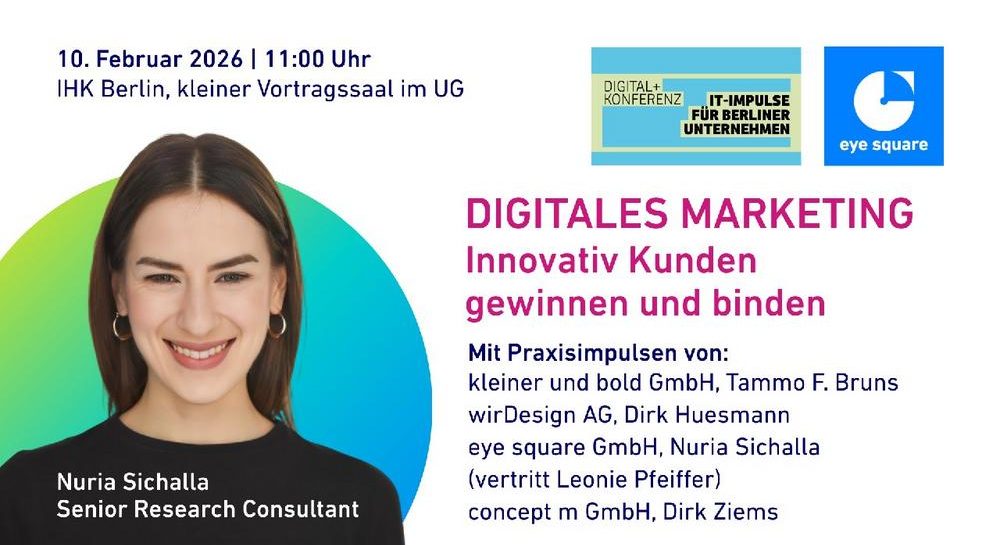 Die Digital + Konferenz, organisiert von der IHK Berlin, HTW Berlin und der Handwerkskammer, findet am 10. Februar 2026 statt und bietet ein Programm für Entscheidungsträger zu digitalen Themen. Eines der Highlights ist der Themenblock „Digitales Marketing – Innovativ Kunden gewinnen und binden“. Unsere Brand und Media Expertin Nuria Sichalla wird aus der Perspektive von…„Digital+ Konferenz IHK Berlin (Konferenz | Berlin)“ weiterlesen